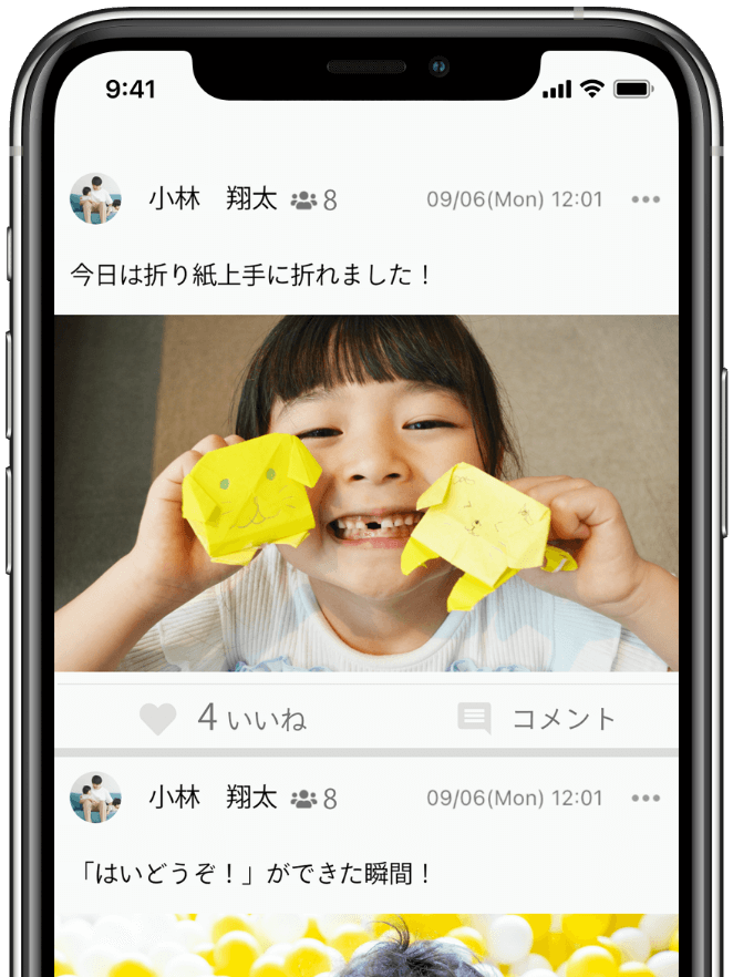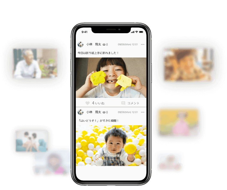 子供のこと、自分のこと、日々の出来事を投稿してタイムライン形式で家族と共有できます。操作はとってもかんたん!
